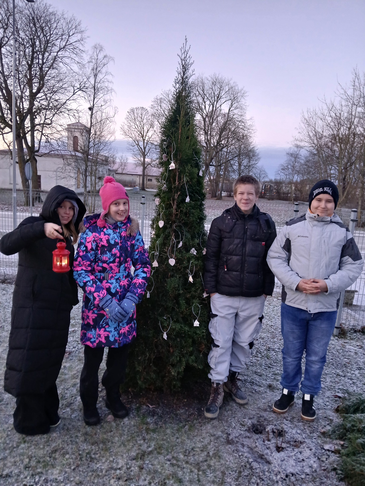 Kõigepealt panid 6. klassi õpilased helkuritele nöörid külge ja seejärel riputasid need kooliõue tuiale.